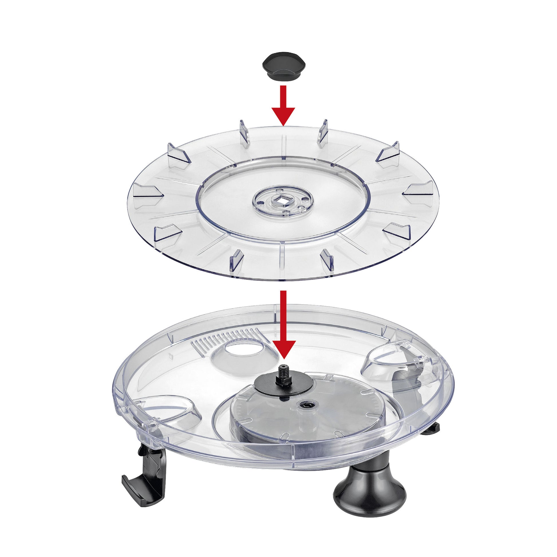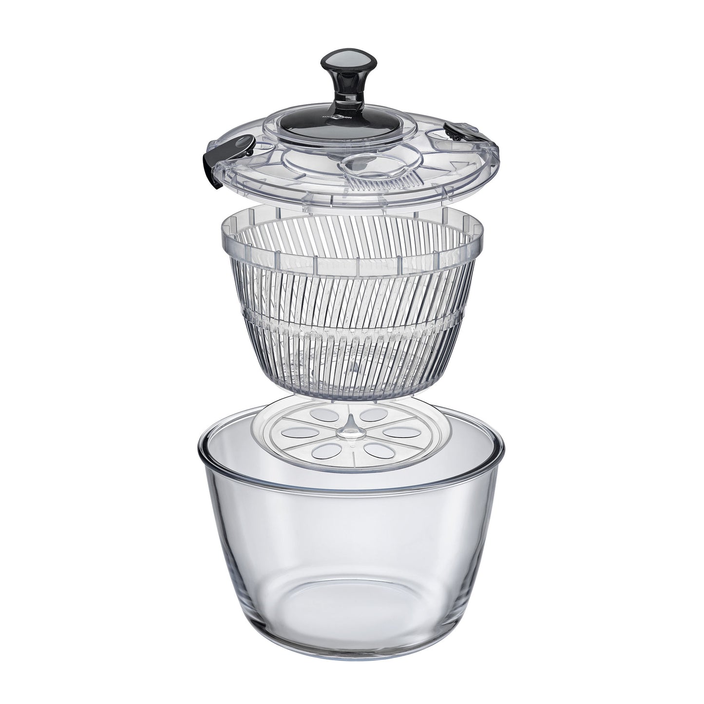 Glasschüssel, Korb, Basisplatte und Deckel mit Kurbel